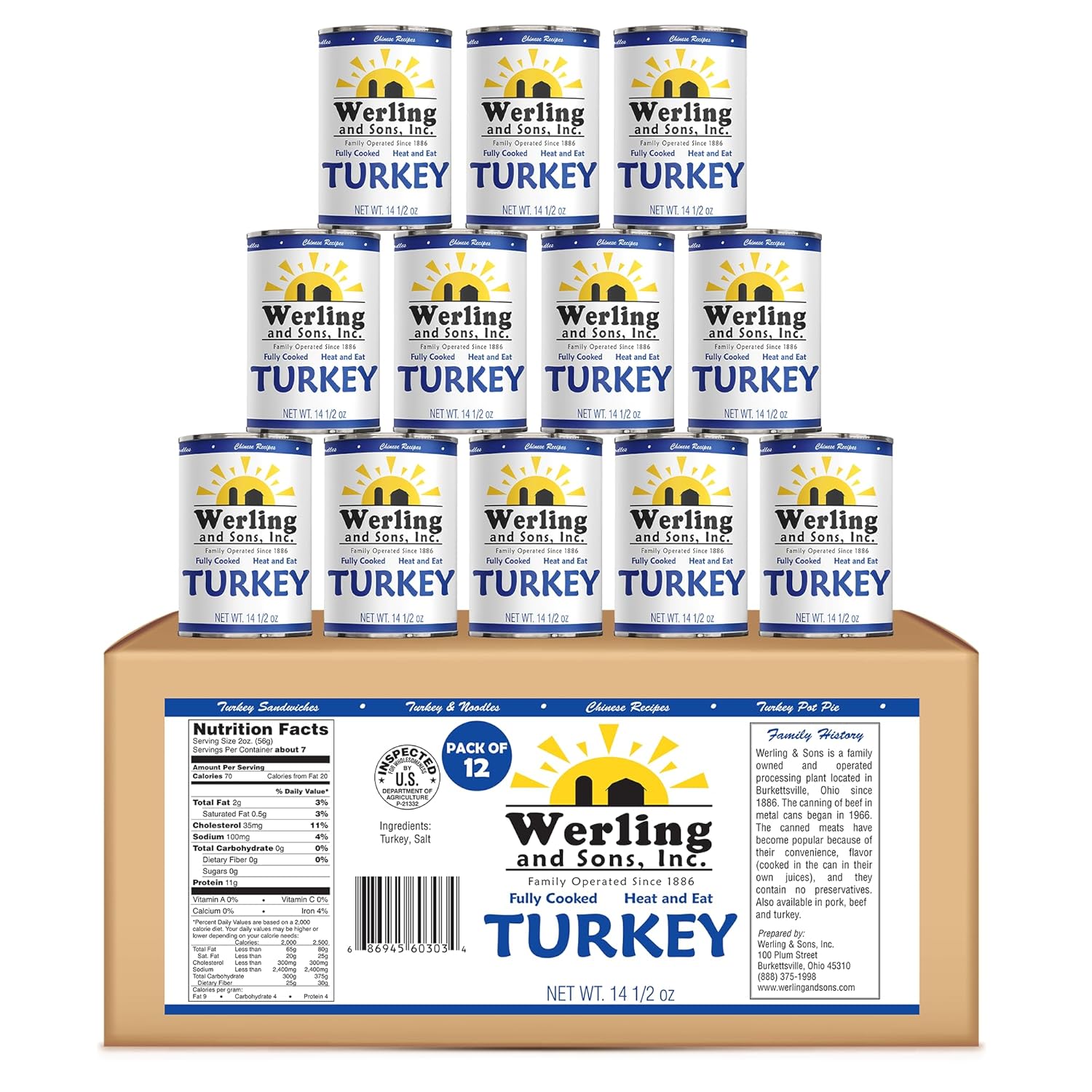Werling & Sons Fully Cooked Canned Turkey Meat 14.5 Oz Heat & Eat Premium Quality Recipe Ready Canned Meat for Everyday Quick Meals, Camping, Emergency Canned Food & Survival Preparedness Pack of 12